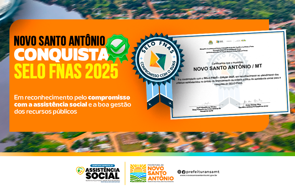 Novo Santo Antônio recebeu o Selo FNAS 2025, concedido pelo Fundo Nacional de Assistência Social (FNAS) aos municípios que demonstram excelência na gestão dos recursos públicos destinados à política de assistência social.